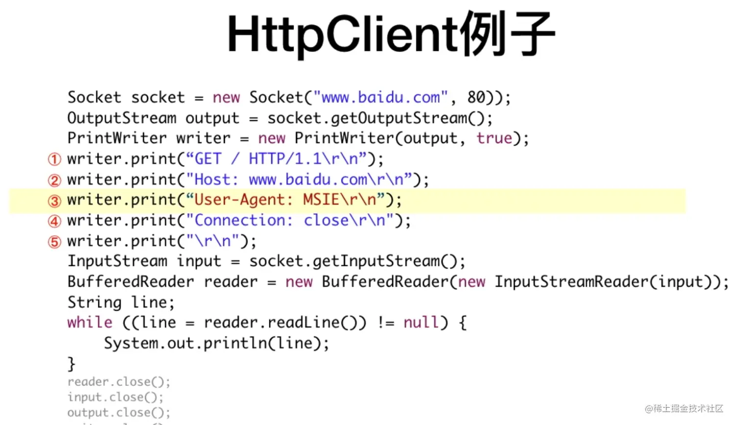 第一行表示GET方法,GET后面跟的是资源地址,像这里一个反斜杠/ 表示请求的是根目录。继续往后就是HTTP的版本号 1.1版本。第一行就是固定的,表示方法、资源、版本号。