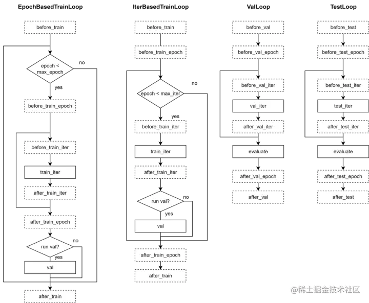 MMEngine 归纳总结了 MMCV 开发过程中,社区同学、下游仓库提出的各种意见,重新设计了 Runner 的训练/验证/测试流程和 Hook 点位。