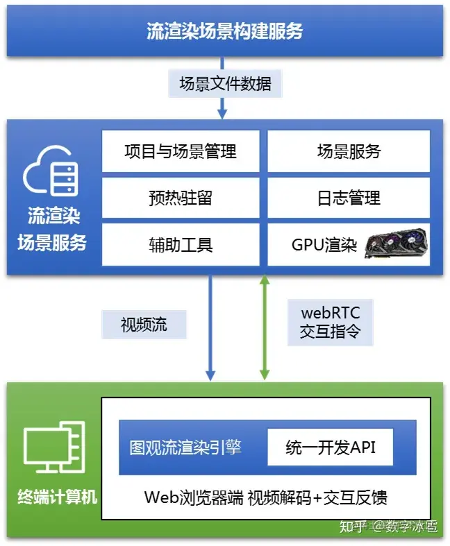 场景底座基于流渲染架构构建,通过使用图观流渲染场景服务,实现场景服务便捷迁移和部署,采用视频串流技术将高性能三维渲染画面实时传送给用户,突破终端限制,用户无需安装下载任何内容,通过任意现代网络浏览器即可访问高质量数字孪生应用,并支持终端用户和云端应用的实时交互,便捷进行后续二次开发工作。