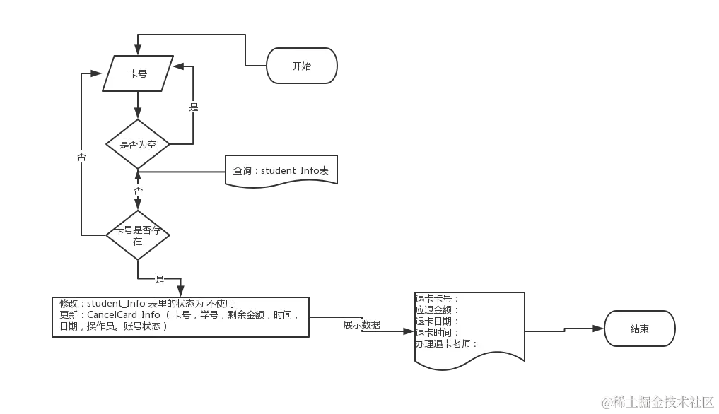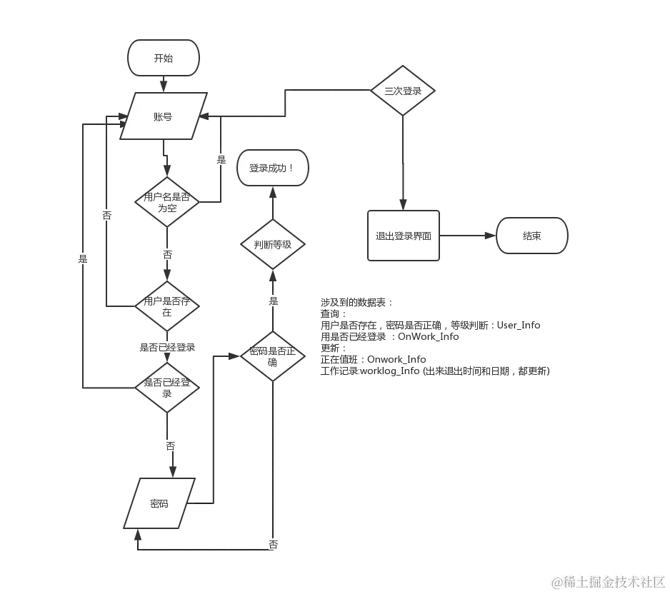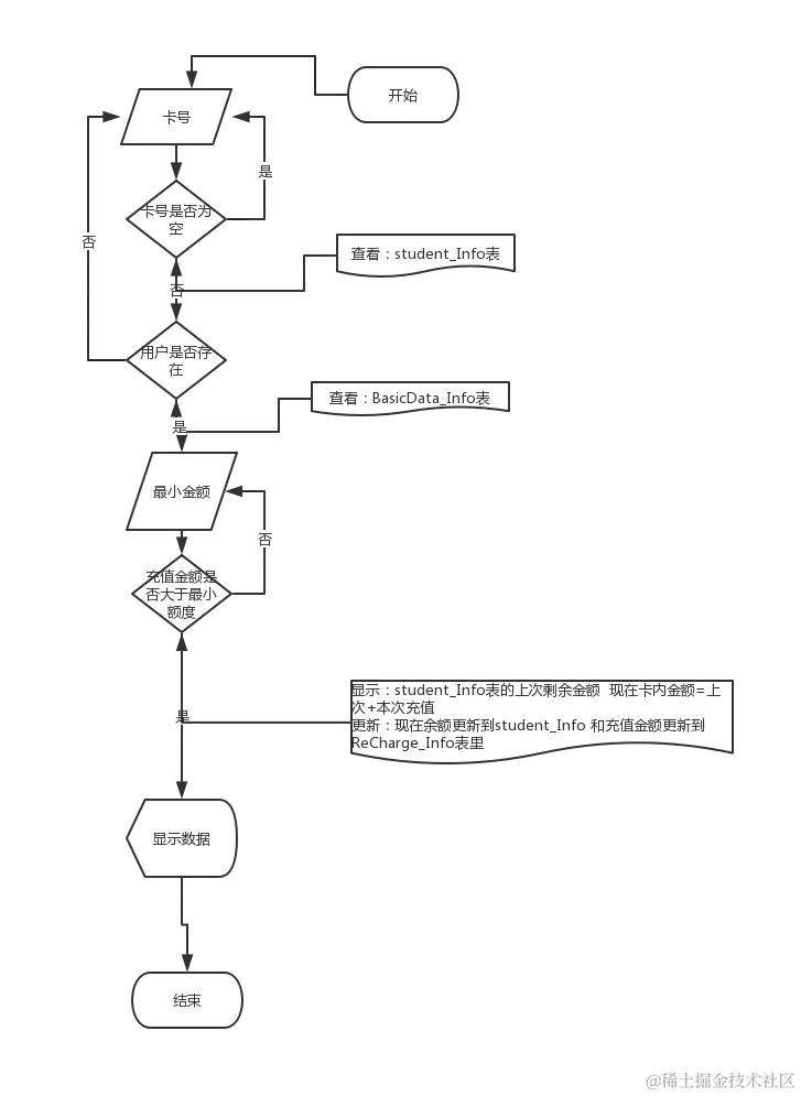 VB版机房收费系统流程图--00 康世行 2022-10-10 66 阅读1分钟 前言:在完成学生信息管理的时候没有化流程图因为,学生有源码。但是机房收费系统几乎没有源码。有都是零零散散的,不是一个人写的所以不连贯。思路已不是很一致,功能一样但是人的思想是不一样的。所以实现方式上是有些差距的,流程图大致上都是一样的。因为要实现的功能都一样,下面我就分享一波我在做机房收费系统的时候化的一些流程图。 目录 登录 查询 操作员 退出: 登录 查询 操作员 退出: