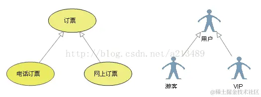就是通常理解的继承关系,子用例和父用例相似,但表现出更特别的行为;子用例将继承父用例的所有结构、行为和关系。子用例可以使用父用例的一段行为,也可以重载它。父用例通常是抽象的。
