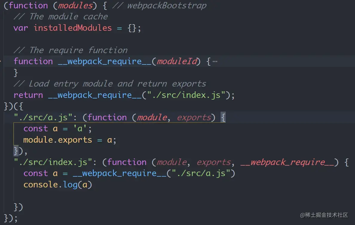 打包结果中删去了一些注释和暂时用不要的代码,可以很明显的看出来实现commonjs模块化的关键就是这个 __webpack_require__ 函数,通过传入模块id来得到模块的导出。