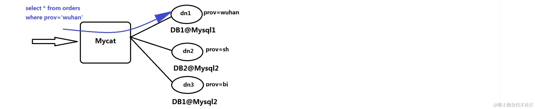 当Mycat收到一个SQL时,会先解析这个SQL,查找涉及到的表,然后看此表的定义,如果有分片规则,则获取到SQL里分片字段的值,并匹配分片函数,得到该SQL对应的分片列表,然后将SQL发往这些分片去执行,最后收集和处理所有分片返回的结果数据,并输出到客户端。以select * from Orders where prov=?语句为例,查到prov=wuhan,按照分片函数,wuhan返回dn1,于是SQL就发给了MySQL1,去取DB1上的查询结果,并返回给用户。
