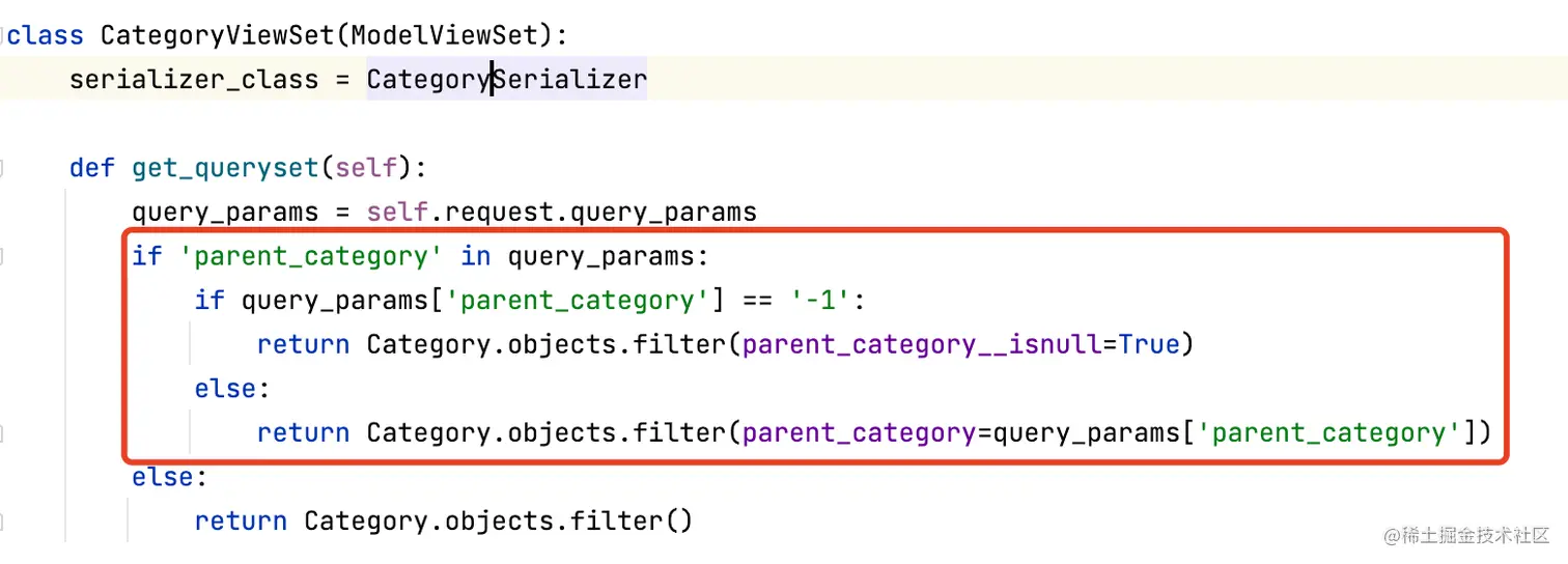 后端目前提供的接口支持查询父分类为null的分类,因此后端接口需要进行改造,通过重写self.get_queryset方法。