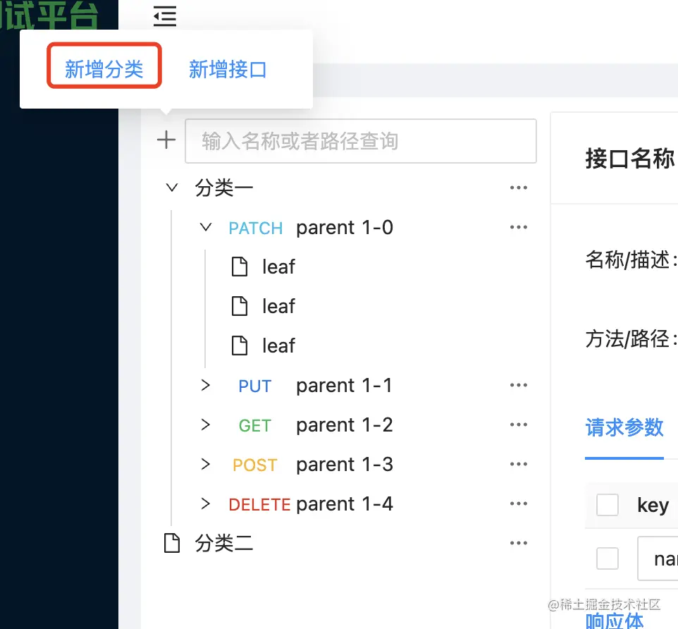 新增分类成功后,还需要刷新树形结构,为避免接口过多导致加载变慢,这里使用Atree组件提供的懒加载功能,即点击展示按钮时请求子节点。 首先查询父分类为空的分类列表和分类为空的接口列表。