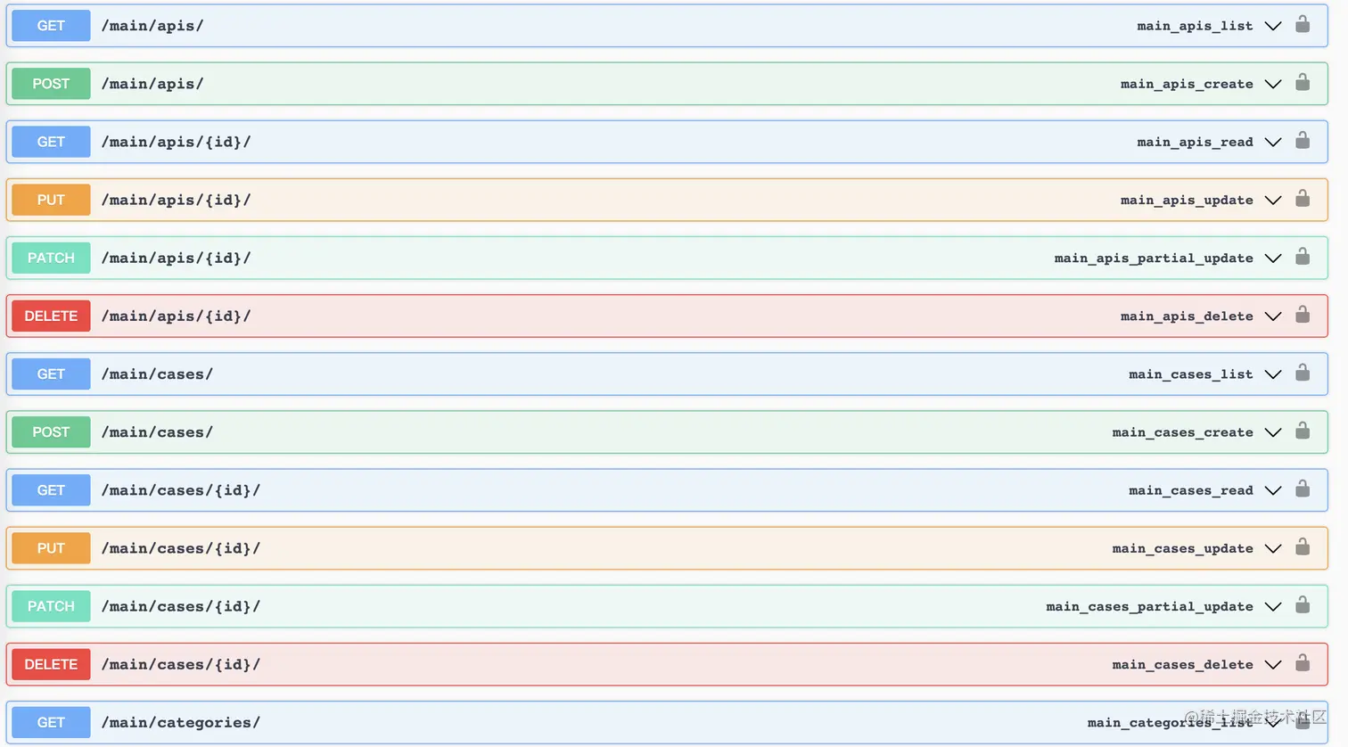 然后在后端项目中mian/views.py中使用ModelViewSet快速定义「分类」、「接口」、「用例」用的简单增删改查接口。