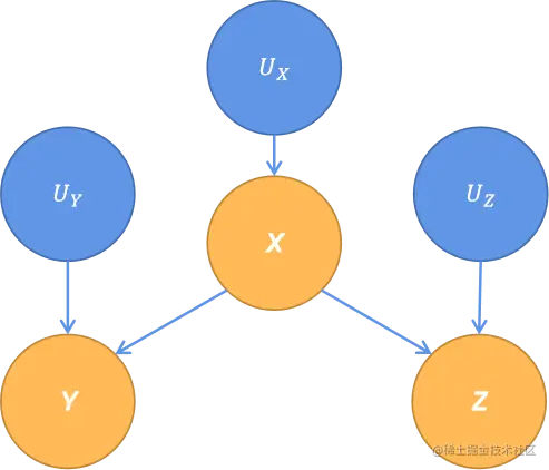可以推理得出,在一个经典的因果模型中,不管具体的函数是什么,由边相连的两个变量是依赖的,所以 Z 和 Y 可能是相互依赖的 ,Y 和 X 也可能是相互依赖的 ,这样的结构被称为链结构。根据以上的事实,有 : 如果 Z 依赖于 Y 的值,而 Y 依赖于 X 的值,那么 Z 很有可能依赖于 X 的值。然而以下情况给出特例,其图模型也与图 2.1 相同。