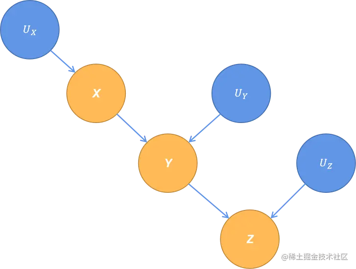 现在来看如图 2.2 所示的图模型。例如,一个城市一天的温度(X)、当天当地冰淇淋店的销售额 (Y) 和当天该市暴力犯罪的数量 (Z) 之间的因果机制。这些变量之间可能的函数关系在 SCM 2.2.5 中给出。或者其可能代表如 SCM 2.2.6 的结构,连接开关 (X) 的状态 (开或关),一个灯泡 (Y) 的状态 (亮或灭),和第二个灯泡 (Z) 的状态 (亮或灭) 的因果机制。外生变量 U X U_X U X 、U Y U_Y U Y 和 U Z U_Z U Z 代表变量相互之间的关系的其他随机因素。