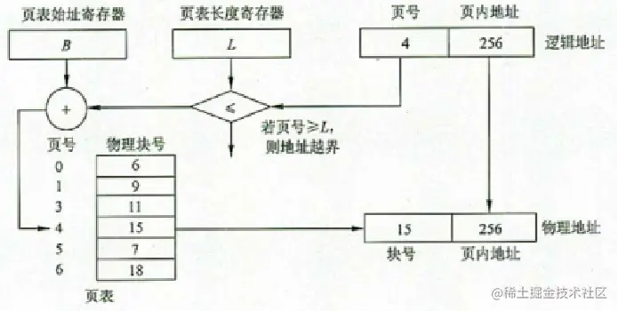 地址变换机构的基本任务是利用页表把用户程序中的逻辑地址变换成内存中的物理地址,即将用户程序中的页号变换成内存中的物理块号。页表寄存器用来存放页表的起始地址和页表的长度。在进程未执行时,每个进程对应的页表的起始地址的长度存放在进程的PCB中,当此进程被调度时,就将它们装入页表寄存器。进行地址变换时,系统将页号与页表长度进行比较,如果页号大于等于页表寄存器中的页表长度L(页号从0开始),则产生越界中断。如未出现越界,则根据页表寄存器中的页表的起始地址的页号计算出此页在表项中的位置,得到此页的物理块号,将此物理块号装入物理地址寄存器中。于此同时,将有效地址(逻辑地址)寄存器中页内地址直接装入物理地址寄存器的块内地址字段中,完成从逻辑地址到物理地址的变换。