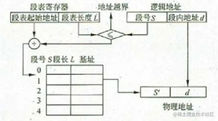 利用段表寄存器中的段表长度与逻辑地址中的段号比较,若段号超过段表长度则产生越界中断。进程在执行中,通过查找到每个段所对应的内存区,实现逻辑段到物理内存区的映射。