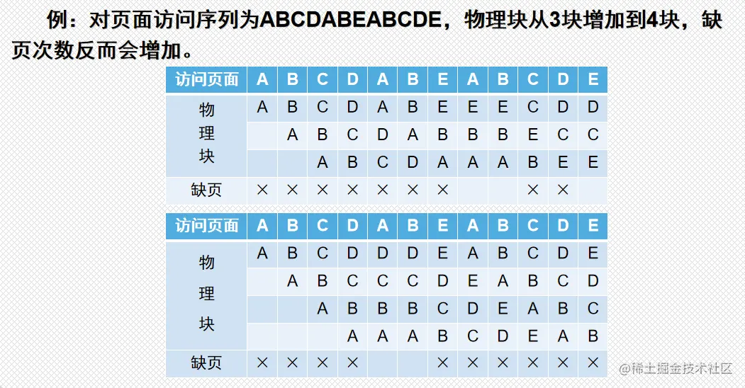 在进程运行过程中,如果发生缺页而内存中又无空闲块时,为了保证进程能正常运行,就必须从内存中调出一页程序或数据送入磁盘的对换区。但究竟将哪个页面调出,需要根据一定的页面置换算法来确定。置换算法的好坏将直接影响系统的性能,不适当的算法可能会导致刚被换出的页很快又被访问,需重新调入,使得系统频繁地更换页面,以致一个进程在运行中把大部分时间花费在页面置换工作上,称此进程发生“抖动”(Thrashing,也称颠簸)。请求分页系统的核心问题是选择合适的页面置换算法。