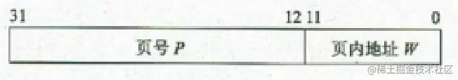 分页系统的地址结构由两部分组成:前一部分为页号P;后一部分为偏移量W,即页内地址。下图中的地址长度为32位,其中011位为页内地址(每页大小为4KB),1231位为页号,所以允许的地址空间大小最多为1MB个页。