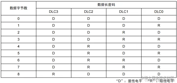 数据长度码(DLC)与数据的字节数的对应关系如下表所示: