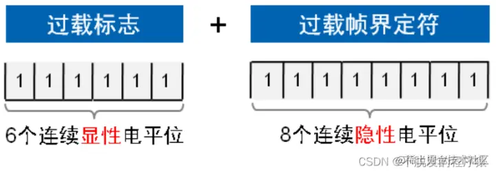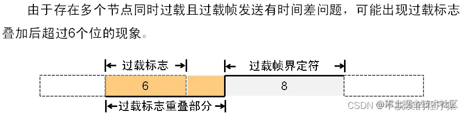 - 过载标志由6个位的显性位组成,过载标志的构成与主动错误标志的构成相同。过载标志其形式破坏了间歇场的固定格式,结果使其他所有节点也检测到了一个出错状态,就都各自送出一个超载标志。