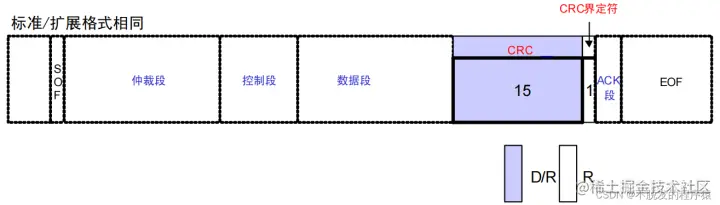 ACK段用来确认是否正常接收。由 ACK 槽(ACK SLOT)和 ACK 界定符(ACK DELIMITER)2 个位构成。