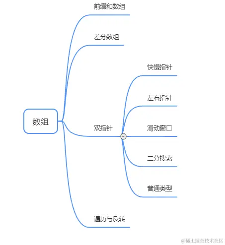 兄弟们,上篇文章讲了双指针的快慢指针,双指针是数组类算法题中最重要的一个分支之一。这篇文章讲双指针技巧的左右指针技巧。文章很长,几乎涵盖了所有的左右指针技巧,希望大家能耐心看完。另外,数组有下图这些知识点与技巧。