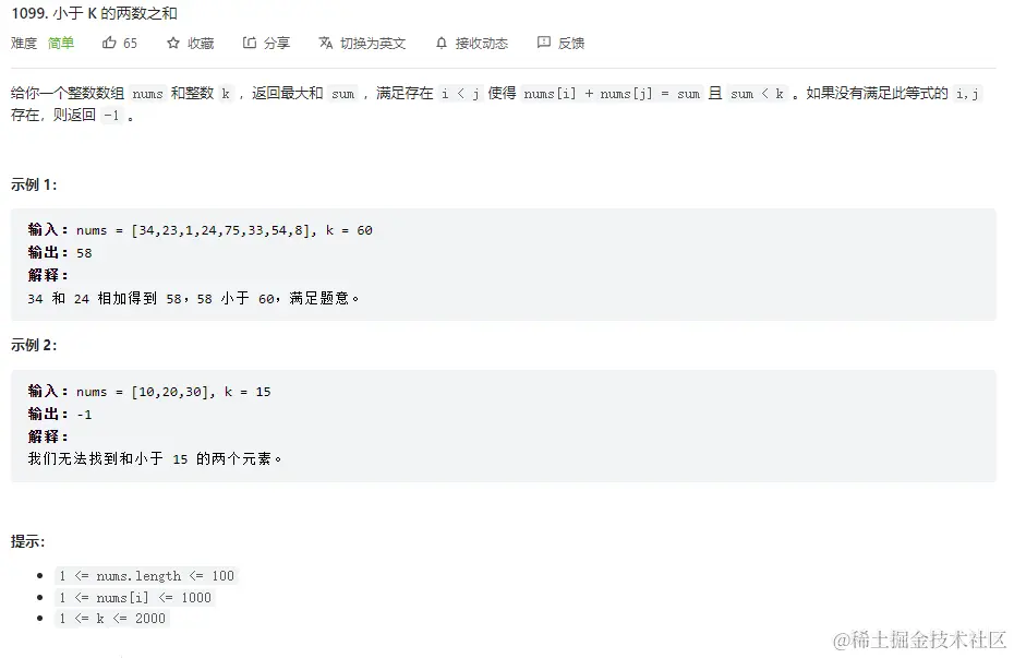 public int twoSumLessThanK(int[] nums, int k) {