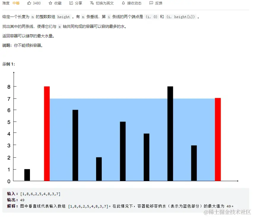 - 哪个指针指向的元素小,就往中间移动,相同时任意往中间移动一个指针并更新容纳水的最大值。