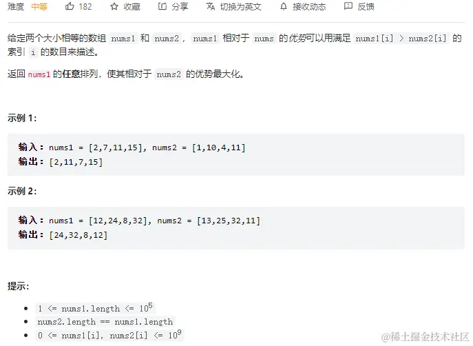 用nums1的上等马与nums2的上等马比较,如果有优势(即num1中最大的数>nums2中最大的数),则使用nums1的上等马,如果没有优势,则使用nums1的剩余的下等马(即nums1中未使用过的数中最小的那个)。