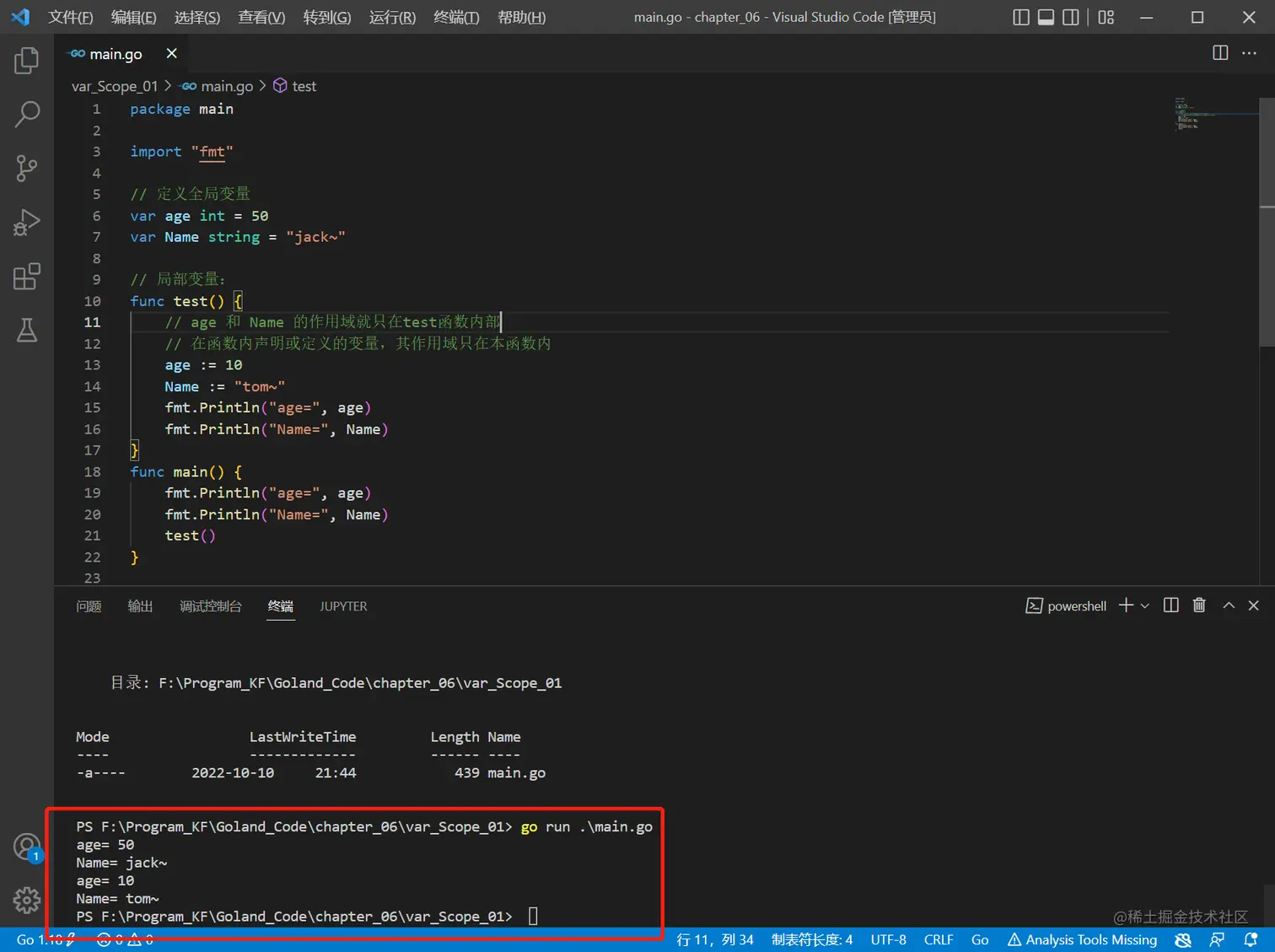 - 函数外部声明/定义的变量叫做全局变量,作用域在整个包都有效,如果其首字母为大写,则作用域在整个程序有效。