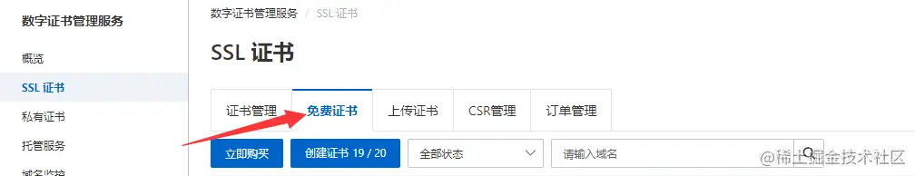 在控制台搜索“ssl免费证书”然后进入首页找到免费证书然后跟着流程申请即可。