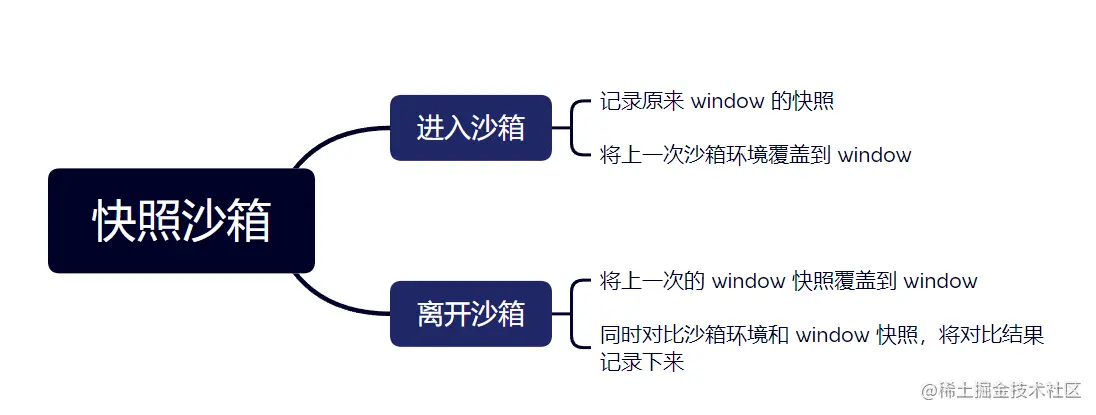 沙箱最大的作用就是做环境隔离,对于代码来说就是做代码之间的隔离。 应用 A 过来执行后,离开时要把环境恢复成原来的样子,不然当加载应用 B 时,就会用到应用 A 在全局留下的内容,从而造成环境污染。