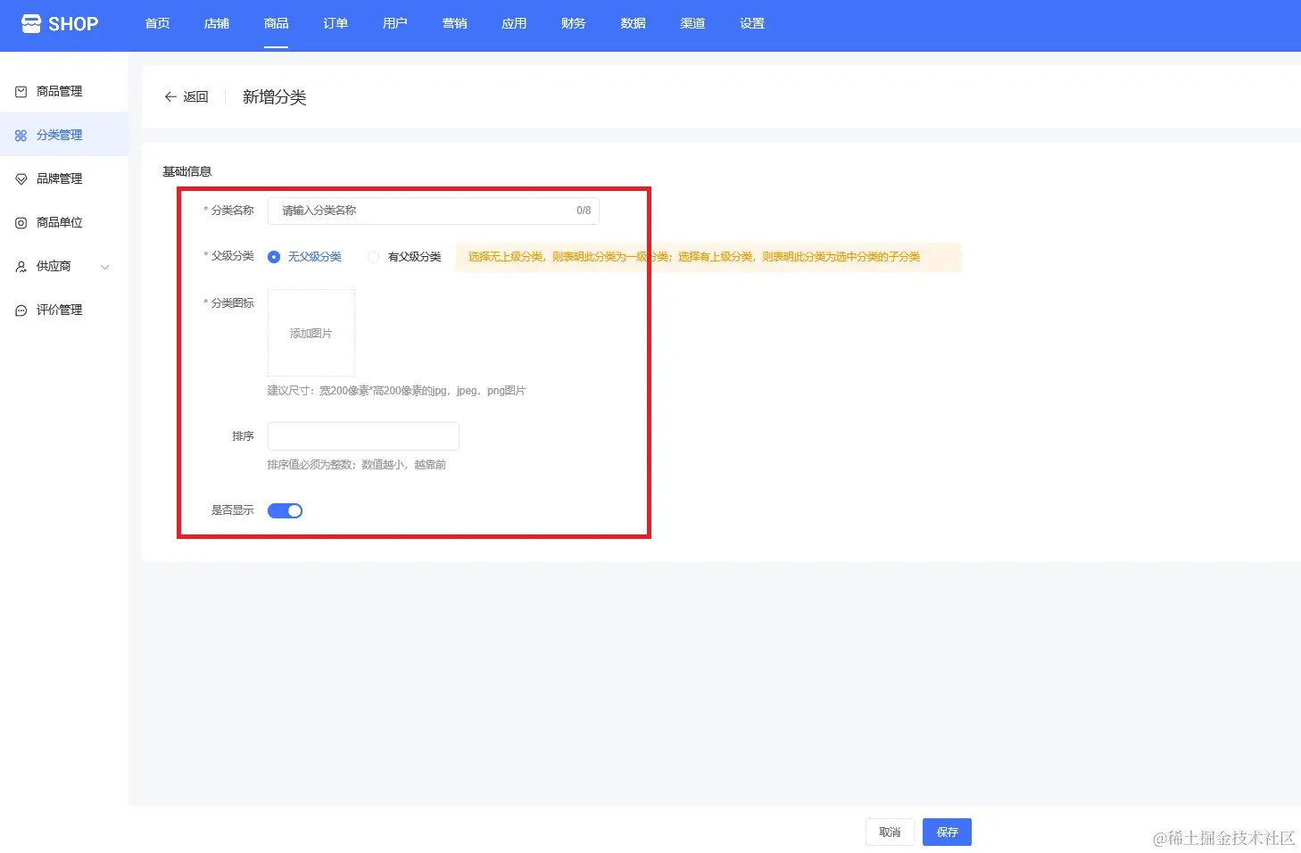 (单商户高级版商城系统—分类管理—新增商品分类)