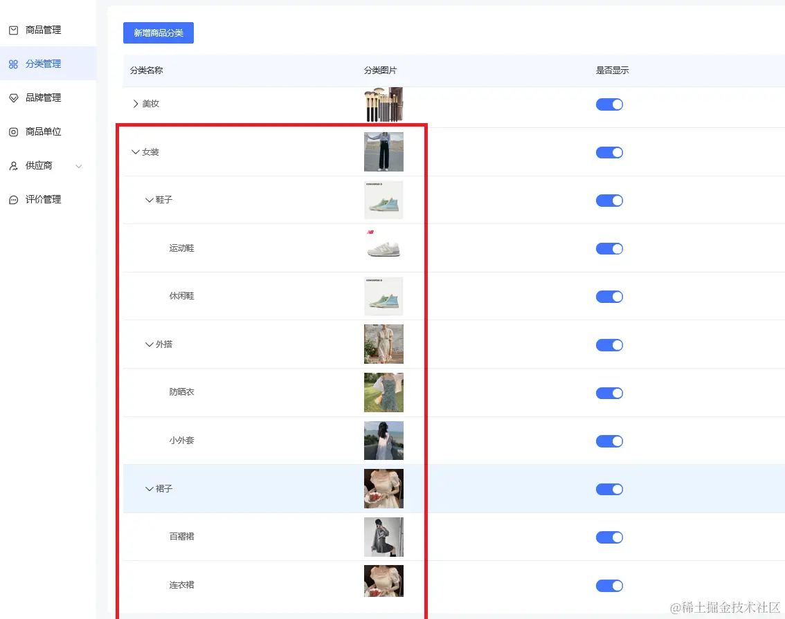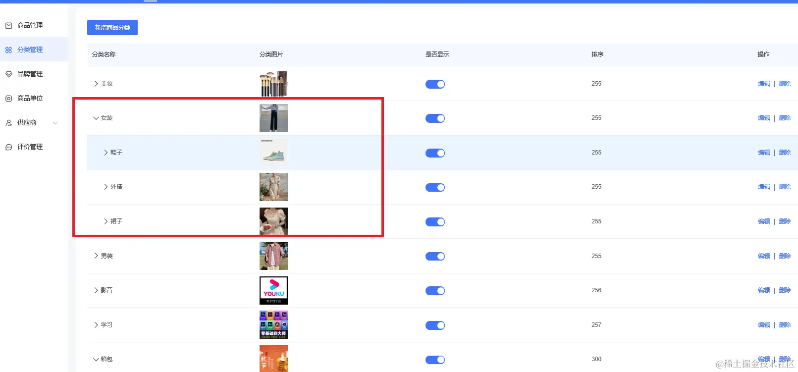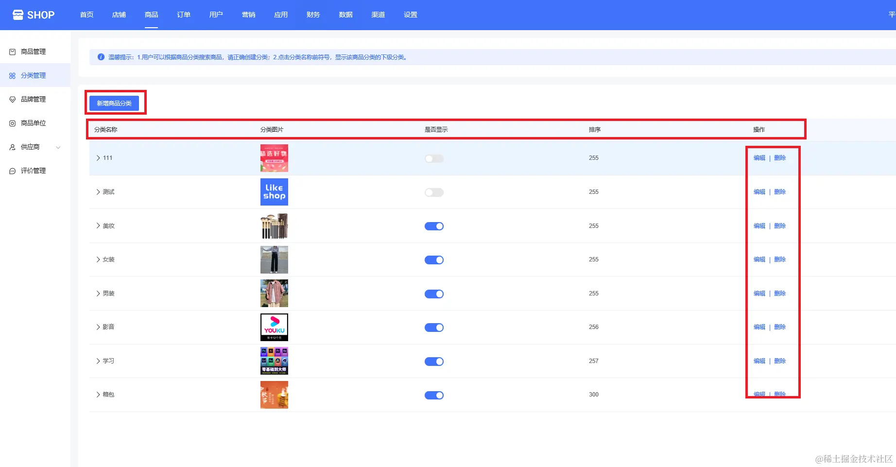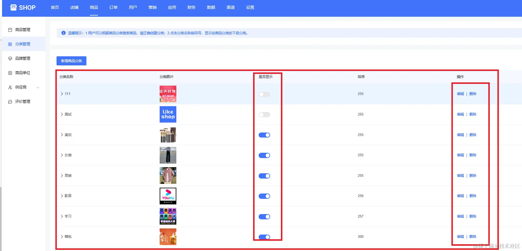 创建好商品分类,可以看到分类名称、分类图片、排序等,可以设置是否显示、重新编辑或删除等操作,如下图所示: