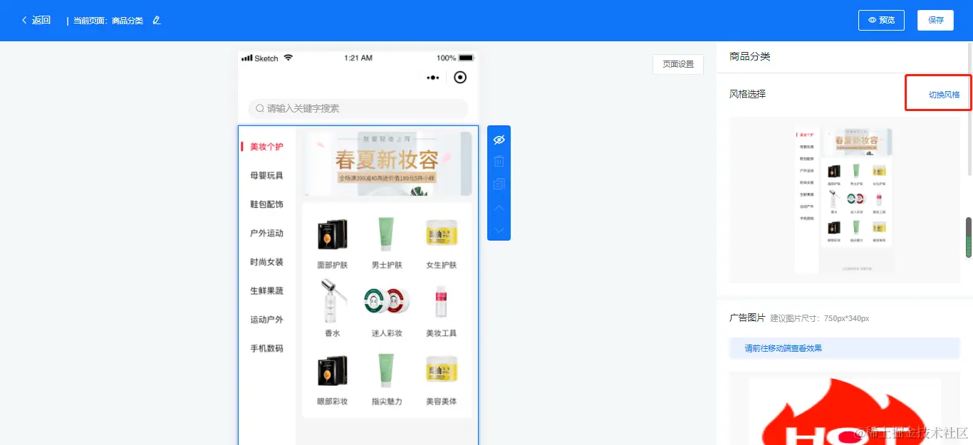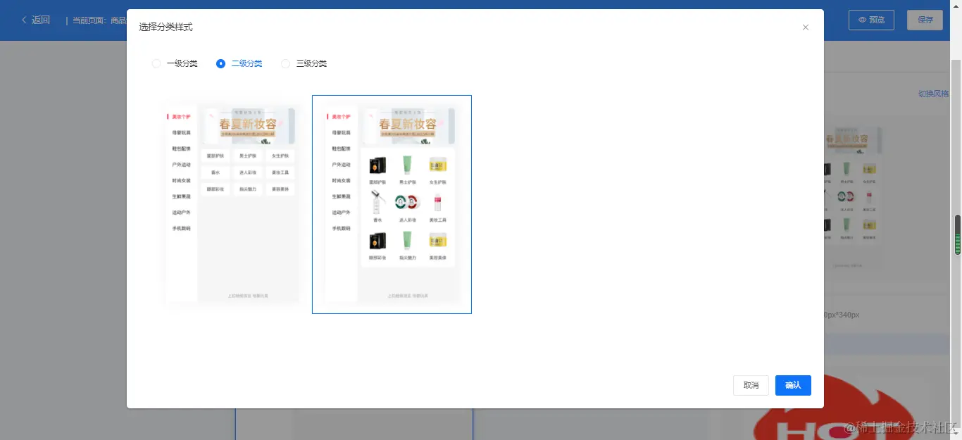 C端分类布局需要在后台-店铺-商城分类-页面设置-切换风格里面选择样式,如下图所示: