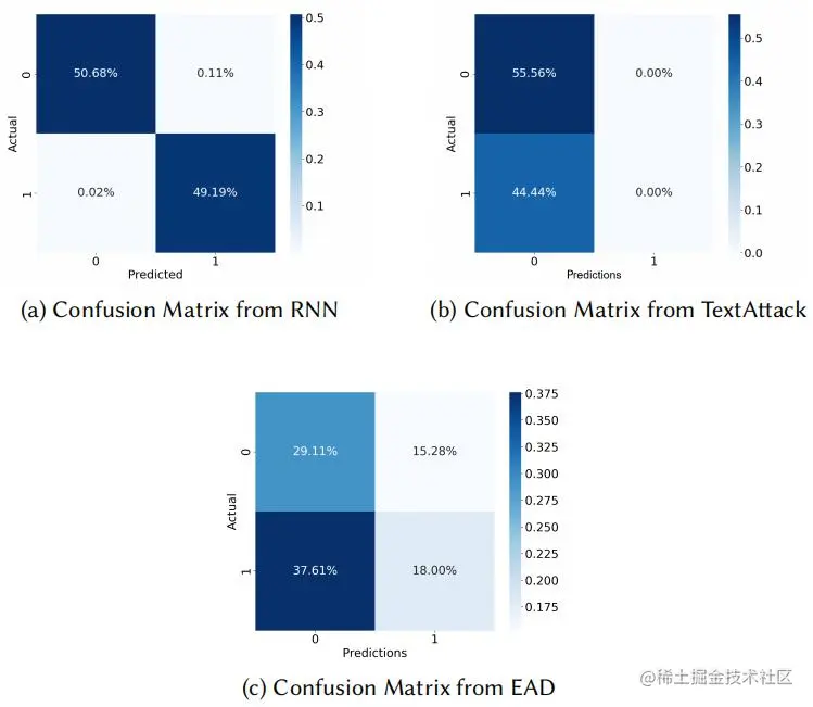 借助 TextAttack,AE 能够成功地在攻击方面欺骗分类器,同时还允许良性数据包流保持良性。EAD 混淆矩阵也显示出类似的结果,但方差略大。两次攻击都有很高的误报率,这是攻击的目标。它们也有很高的真阳性率,这表明它们可以保留良性数据包而不会将它们转化为可分类的攻击。被归类为良性的攻击的百分比用于计算攻击成功率。结果表明,这两种算法都能够产生能够欺骗 DNS 放大分类器的高质量 AE。