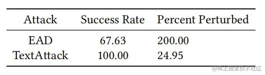图示:EAD vs TextAttack Perturbation Percentage and Success Rate。(来源:论文)两种算法在平均扰动百分比方面存在巨大差异。EADs 高扰动率的原因是因为它作为优化的一部分始终将数据包特征全部扰动为 0,从而导致 200% 的距离。TextAttack 创建了一个更正常的距离,因为每个单独的数据包特征单独受到单个字符插入或删除的轻微干扰。