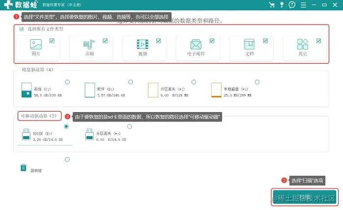 第二步:选择“文件类型”,选择要恢复的图片、视频、音频等,也可以全部选择。由于要恢复的是sd卡里面的数据,所以恢复的路径选择“可移动驱动器”,选择好后,点击“扫描”,系统就开始快速扫描了。