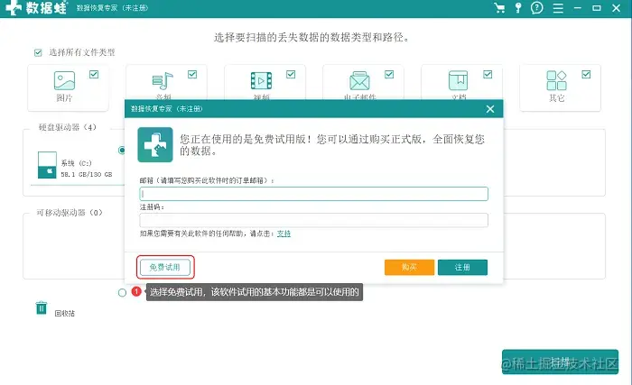 第一步:下载数据蛙官方软件,并且把要恢复的sd卡与电脑连接起来。(选择免费试用,该软件试用的基本功能都是可以使用的)。