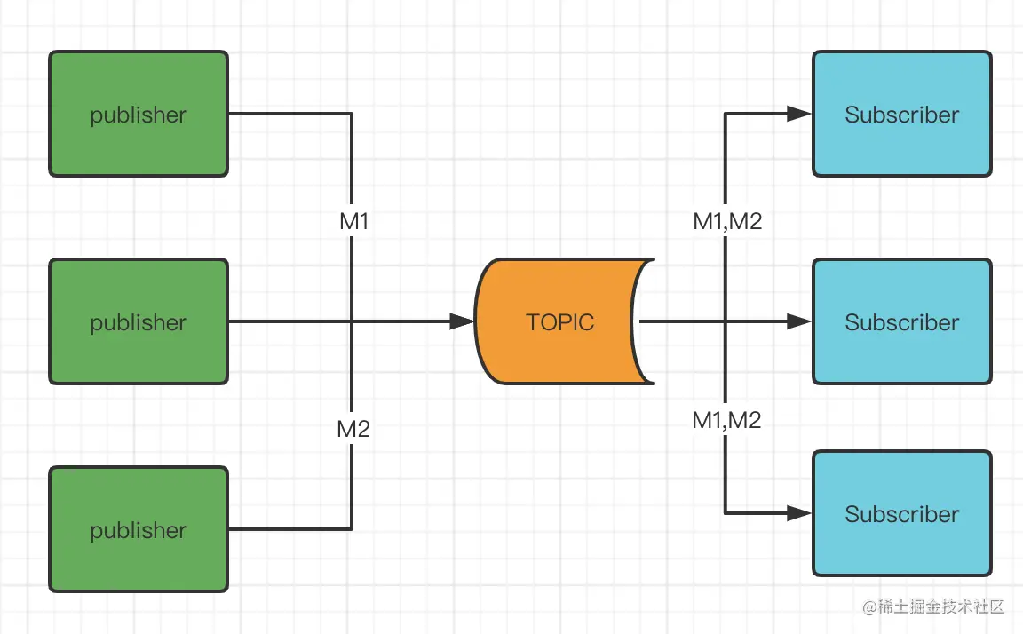 - P2P (point to point) 点对点消息传输模型,消息提供方和消息消费方通过先进先出队列 提供给消息消费者,消息消费者从队列主动拉取数据。