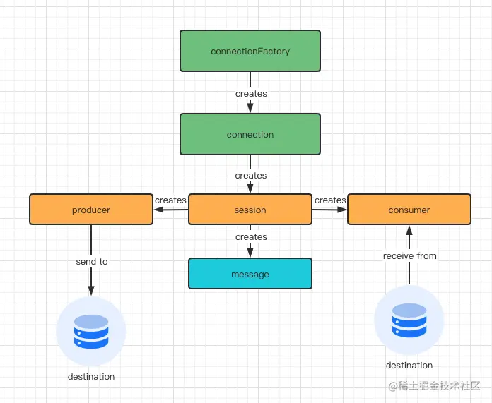 | connectionFactory | queueConnectionFactory | TopicConnectionFactory | 基于工厂模式,创建和jms提供者之间的链接,需要制定链接的url和协议,任何jms客户端和jms提供者之间的交互,都必须要制定链接 |