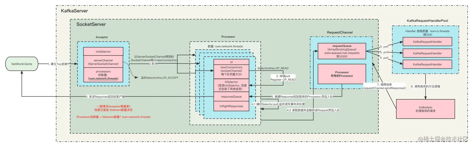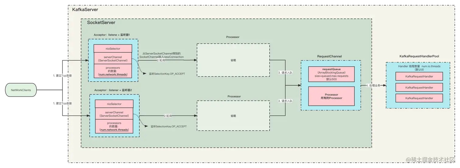 在 Kafka 启动的时候, 会根据 Listener 配置,启动对应个数的 Acceptor 和 Processor