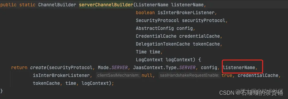Kafka 启动的时候会创建对应个数的 Acceptor,这个 Acceptor 持有很多的信息, 比如 ChannelBuilder, 这个 ChannelBuilder 持有 ListenerName, 如下图所示