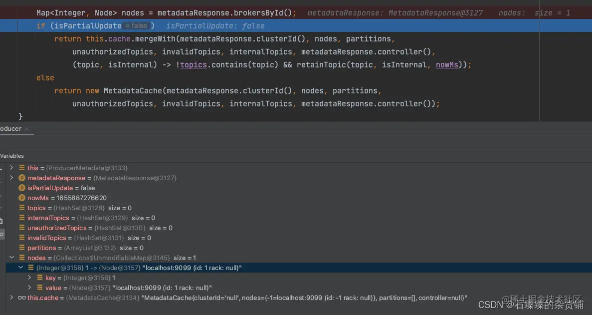 private MetadataCache handleMetadataResponse(MetadataResponse metadataResponse, boolean isPartialUpdate, long nowMs) { //省略部分 Map<Integer, Node> nodes = metadataResponse.brokersById(); if (isPartialUpdate) return this.cache.mergeWith(metadataResponse.clusterId(), nodes, partitions, unauthorizedTopics, invalidTopics, internalTopics, metadataResponse.controller(), (topic, isInternal) -> !topics.contains(topic) && retainTopic(topic, isInternal, nowMs)); else return new MetadataCache(metadataResponse.clusterId(), nodes, partitions, unauthorizedTopics, invalidTopics, internalTopics, metadataResponse.controller());
