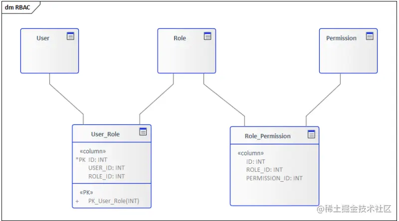 如下图就是一个经典RBAC0模型的数据库设计。