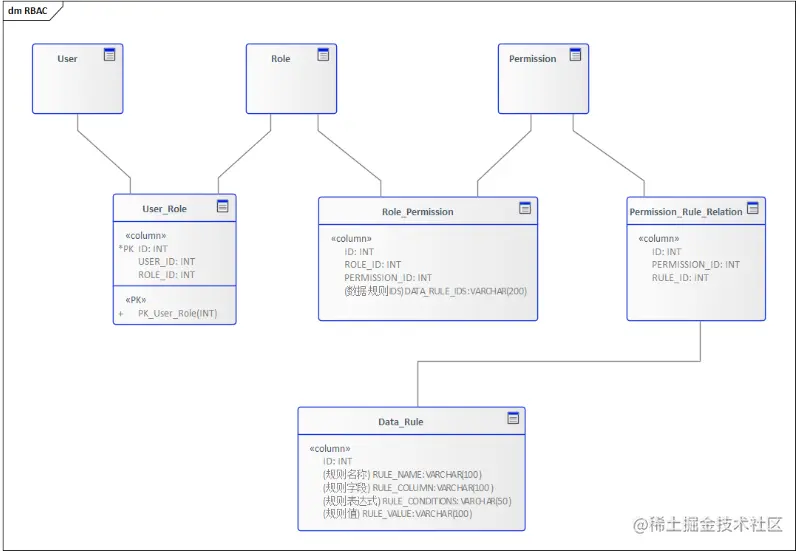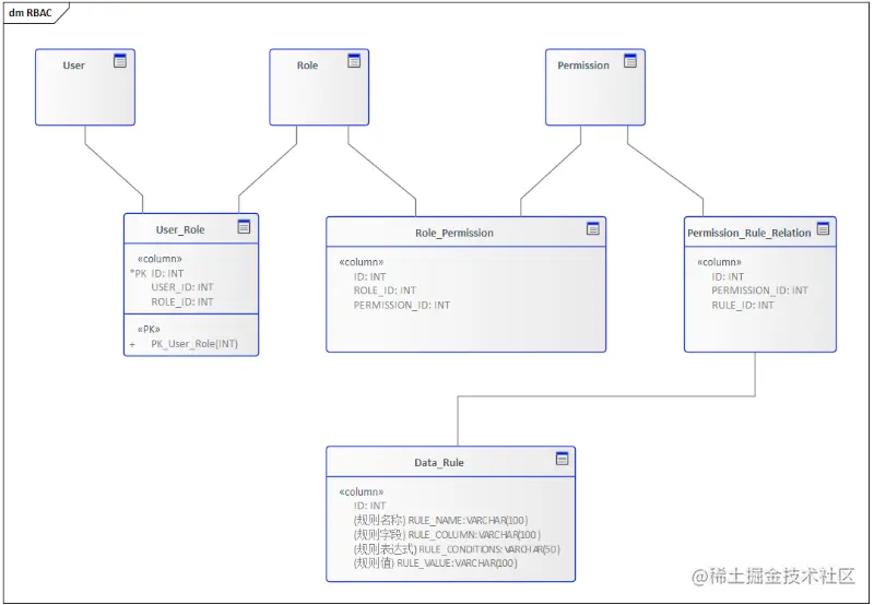 在RBAC模型中,用户是通过授予不同的角色来进行资源的管理,同理我们可以让角色在授予权限的时候关联上数据规则,这样最终在系统上就体现为不同的用户拥有不同的数据规则。