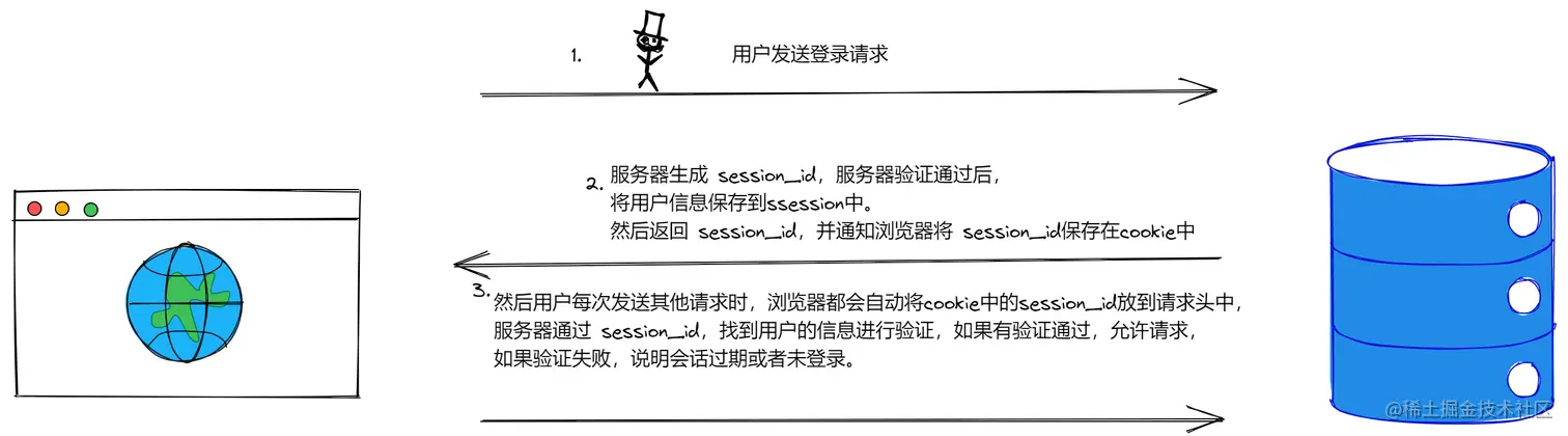用户登录通过后,服务端将用户相关的数据保存到 session(当前会话)中,并将对应的 session_id 发给浏览器,浏览器将 session_id 保存到 cookie中;然后用户每次发送请求,浏览器会自动将session_id 从 cookie中取出放到请求头中;服务器收到请求后,通过session_id 找到对应的 session 会话,然后获取 session 中的用户信息,来完成用户的合法校验。当用户退出系统或 session 过期销毁时,客户端的 session_id 也就无效了。