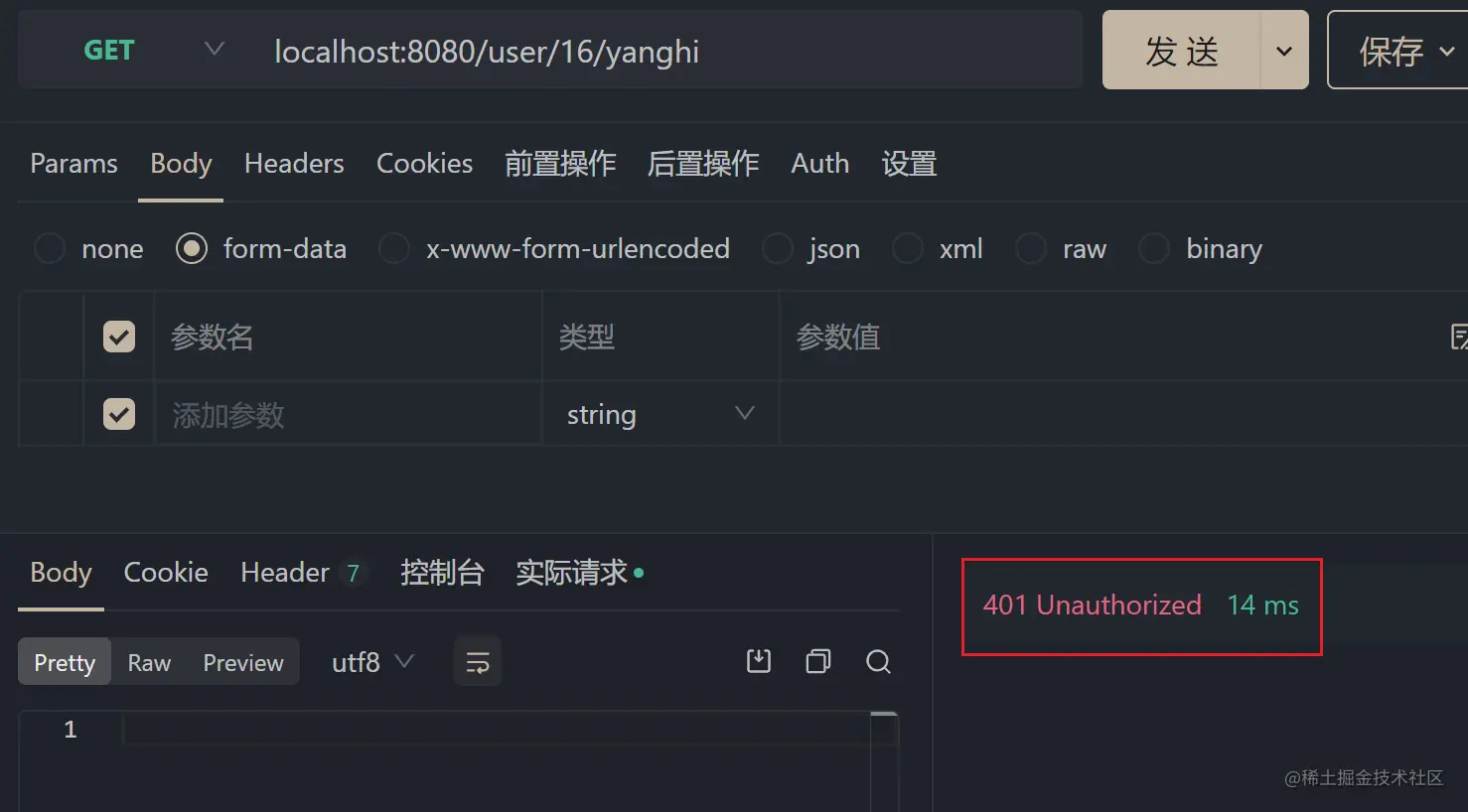 然后试着去访问其他接口,不把 token 放入请求头时,就返回了 401。