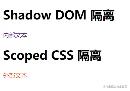 - Shadow DOM 隔离主要利用了 Shadow DOM 硬隔离的特点来做样式隔离