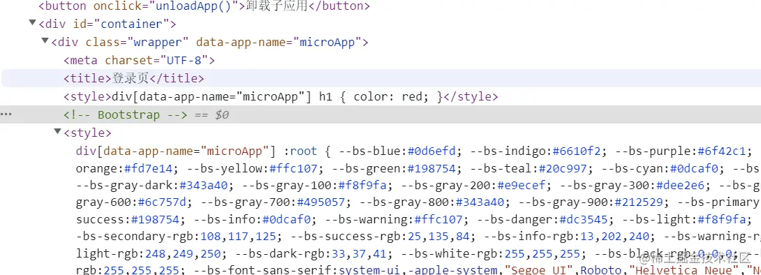 我们打开控制台,会发现微应用的 Bootstrap CSS 代码已经从 <link> “解压” 出来变成 <style> 了: