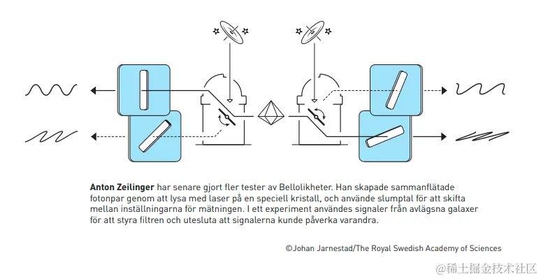 安东·塞林格(Anton Zeilinger)在这个过程之中也做了不少贡献。Zeilinger对贝尔不等式进行了更多测试。他将激光对准一种特殊的晶体,创造了光子纠缠对,并使用随机数在测量设置之间切换。一项实验利用了来自遥远星系的信号来控制过滤器,并确保信号不会相互影响。实用化的量子通信需要把两颗纠缠的光子分开很远的距离。塞林格的团队一次一次的突破记录,从几公里到十几公里,到上百公里。