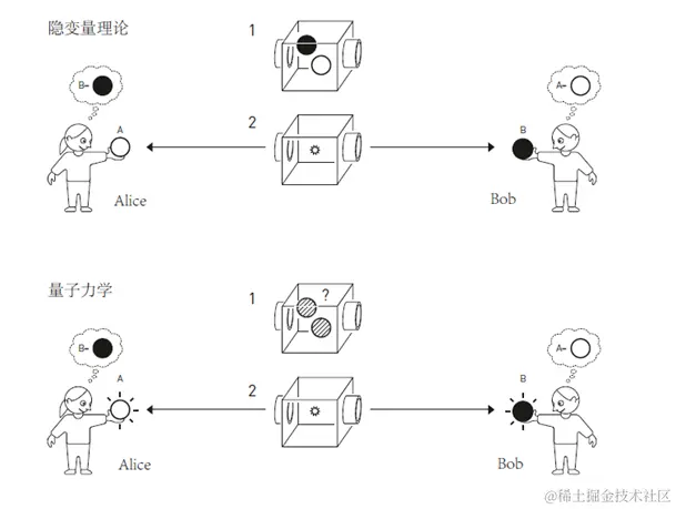 量子力学的纠缠对可以比作一台机器,它向着相反方向抛出反色的球。当鲍勃抓到一颗球,并看到它是黑色的时,他就立刻知道爱丽丝抓到了一颗白色的球。在一种使用隐变量的理论中,这些球总会包含着关于颜色的隐藏信息。但是,量子力学认为,这些球都是灰色的,直到有人看到它们时,其中一颗会随机变成白色,另外一颗则变成黑色。贝尔不等式表明,有一些实验能够区分这些情况。这类实验已经证明了,量子力学的描述才是正确的。