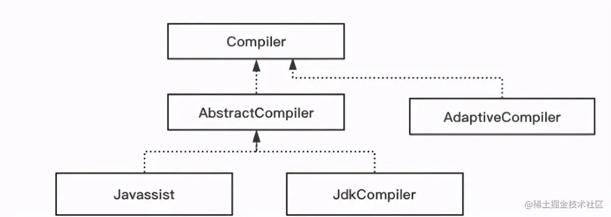 Compiler接口有个@SPI注解,默认代码编译器的实现类为Javassist。其中Java动态生成Class的方式有很多,常见的通过字节码方式如CGLIB/ASM等生成,而Javassist是通过字符串代码再编译为Class的方式完成的。