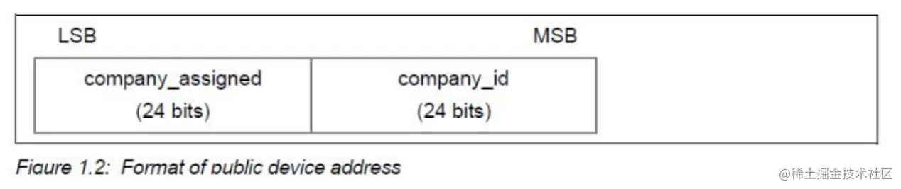 这种地址分配方式在 BLE 中也保留了下来,就是公共设备地址(Public Device Address)。由 24-bit 的 company_id 和 24-bit 的 company_assigned 组成。