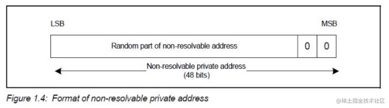 不可解析私密地址和静态设备地址类似,不同之处在于不可解析私密地址会定时更新。更新的周期是由 GAP 规定的,称作 T_GAP(private_addr_int),建议值是 15 分钟。其格式如下: