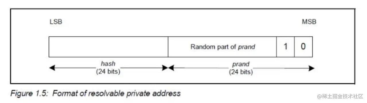- 高位 24bits 是随机数部分,其中最高两个 bit 为“10”,用于标识地址类型;低位 24bits 是随机数和 IRK 经过 hash 运算得到的 hash值,运算公式为 hash = ah(IRK, prand)。
